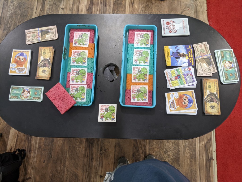 With introductions and reminiscing out of the way, it was time to get to work. At first I started sharing the AiG Noah’s Ark Million Dollar Bills. They are great and have a clear gospel message with the million dollar question: “In the days of Noah, God judged guilty men with a global flood. If you were judged by God on Judgment Day, will you be innocent of guilty?” I also passed out the Dino Bucks Million Dollar Bill and Kids Million Dollar Bill which doesn’t mention adultery to start conversations with people walking the isle outside the booth.