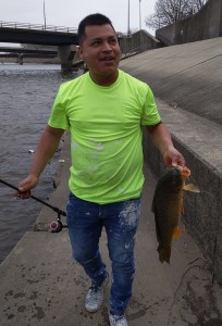 As we walked along the waterway we ran into a few people and handed out some tracts. Then we came across a guy wearing this green shirt and decided to talk to him. Jon asked him if he caught anything. All smiles he lifted up what looked like a 15 in carp. That was a nice fish. So, I walked down to him, gave him a tract and the book, “What Time is Purple.” He was happy, but learned quickly that his English was weak.
