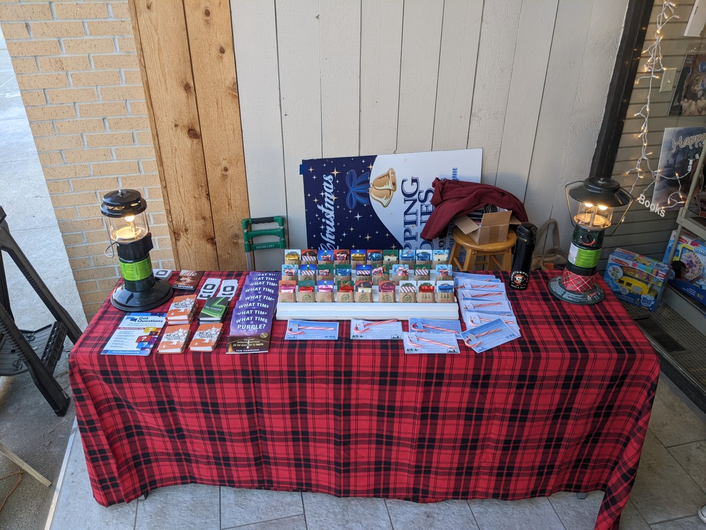 My wife, Lisa, and I rolled into town at about 2:30pm to help Paul set up. By the time we got there he had already gotten all four carafes into the store and started processing the hot chocolate. Lisa and I took the table, lanterns, tracts, and such to the front. Paul decided to use one long thin table instead of two smaller ones from previous years. It was a good decision, which allowed us to have two chairs on the other side for people who wanted to really engage in conversation about Jesus. By the time we got done prepping for the crowds, it was 62 degrees and I was sweating! What a difference from the 14 degrees the previous year.