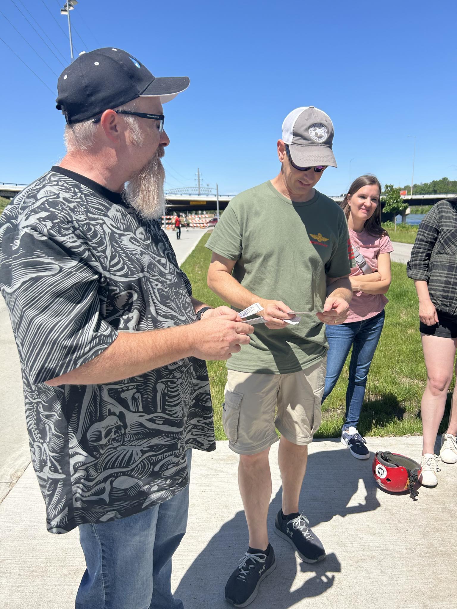 About two hours into the event, I was sharing the gospel and passing out tracts when we realized that almost all of the people there got some. Things looked like they were winding down early. Someone in our group noticed a mob of people on scooters on their way to where we were. Tons of people. Jen, Ryan’s wife, grabbed a stack of million-dollar bills and started handing them out to the mob of skaters passing right in front of us. It couldn’t have been easier. Once she was done, she had a great one-on-one conversation with a young lady and prayed with her. You can tell it was a very special moment, and from the look on the girl’s face, she was feeling the weight of conviction and freedom in the gospel.