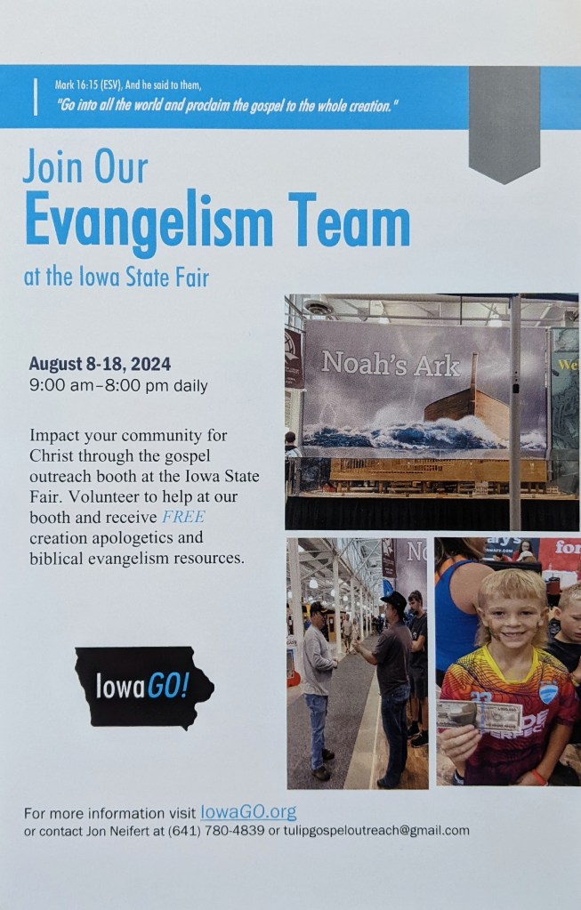 2023 was the final year for Answers in Genesis financially sponsored the Creation Booth. This year, Jon Neifert of Tulip Gospel Outreach and the IowaGo! project, he takes on that burden himself. But he cannot do it alone. He needs help, and you can do that by visiting the donation page and designating your funds for IowaGo!